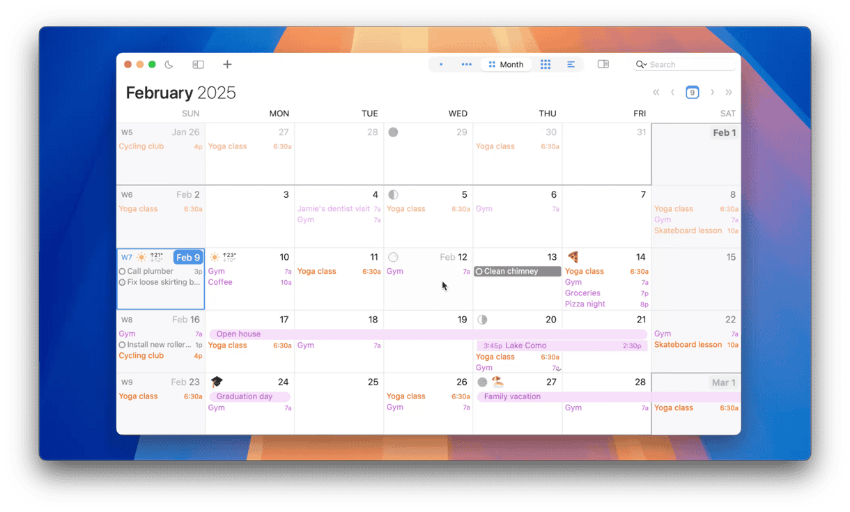 Month view displays one month of your calendar by default (with the option to redefine “month” as any period from 1–12 weeks).